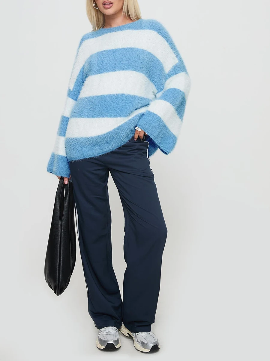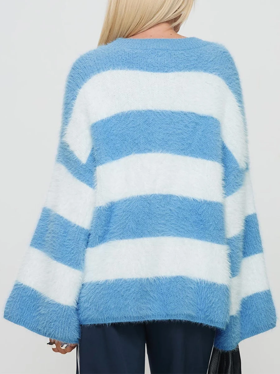 Women's Mohair Loose Sweaters Stripe Print Round Neck Long Sleeve Drop Shoulder Fuzzy Knitwear Tops