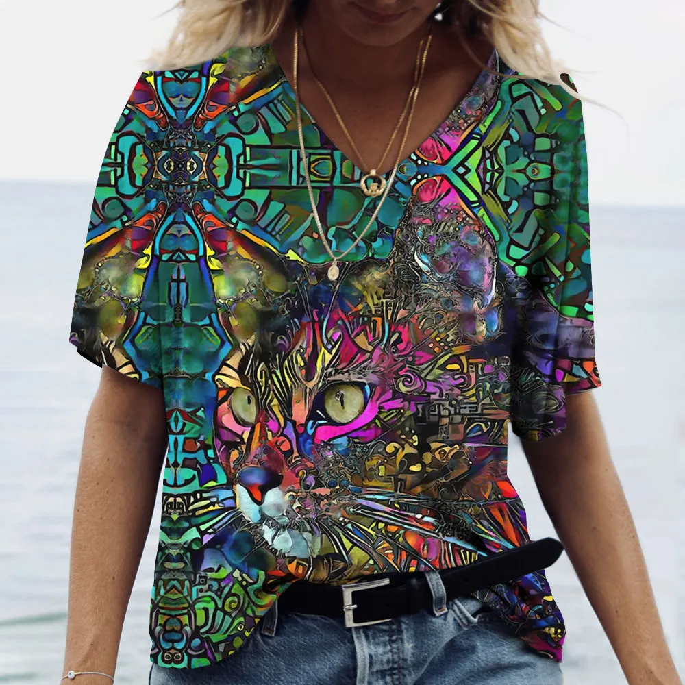 V Neck Tshirt Women's Summer Casual Oversize Dazzle Color Cats Print Shirt Short Sleeve Top Vintage FemaleStreetwear Y2k Clothes
