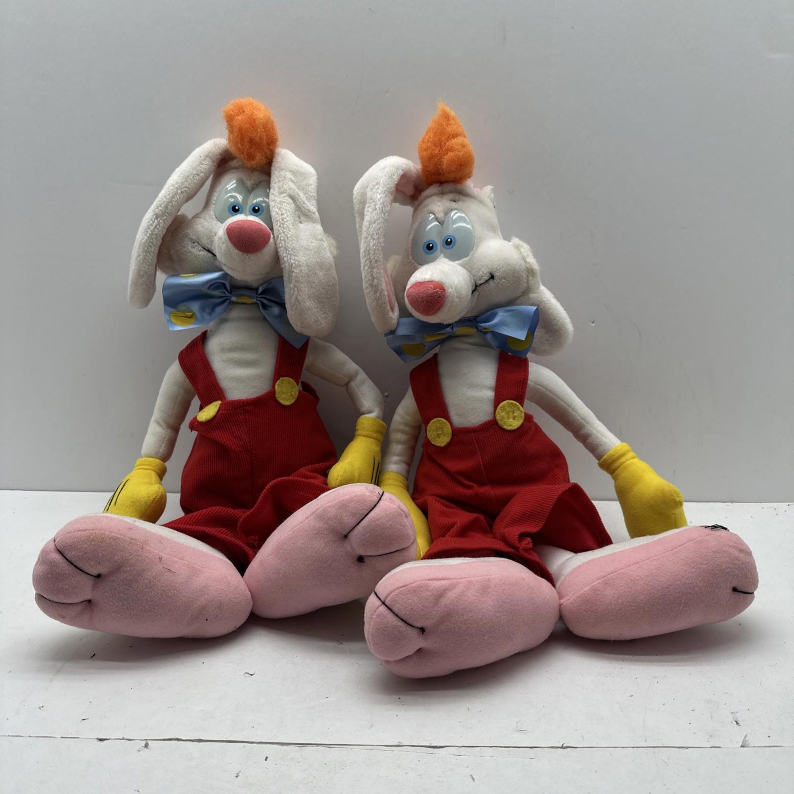 The product is a pair of vintage plush toys of Roger Rabbit, a character from the 1988 film "Who Framed Roger Rabbit." These plush toys are part of the Disney franchise and are officially licensed by Disney. With their nostalgic charm and classic design from the beloved animated film, these plush toys are a must-have for collectors and fans of Disneyana. Perfect for both kids and adults who appreciate the timeless appeal of Roger Rabbit.